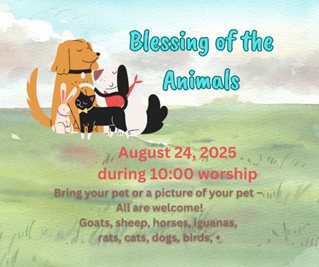 We will be meeting in Fellowship Hall instead of the sanctuary for this Blessing of the Animals service. Animals need to be on lead or in carrier/kennel (dog, cats, bunnies, lizards, birds, etc) with large animals staying outside (horses, goats, sheep, etc).